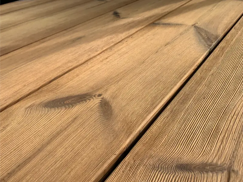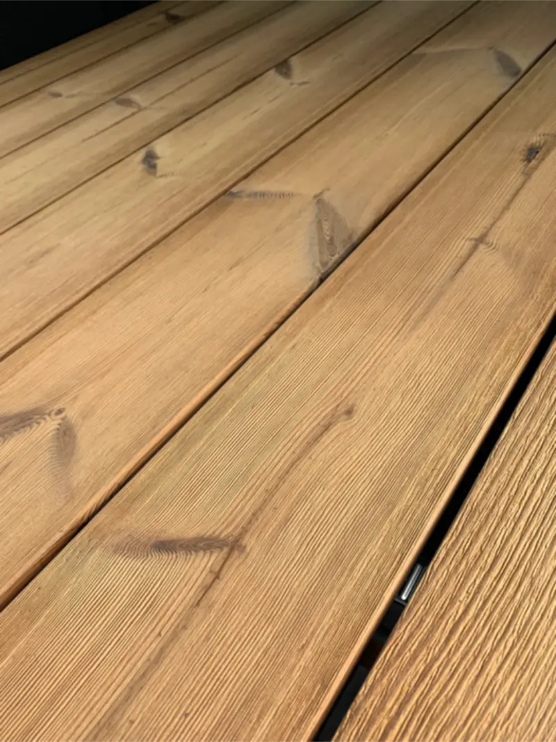 Termowany świerk posiada łagodniejsze sęki niż Termososna, natomiast równie wysoką jakość. Drewno zostało pozbawione nadmiaru wilgoci i żywicy. W zamian zyskało znakomitą stabilność wymiarową oraz odporność na zmienne warunki atmosferyczne. Może zatem pochwalić się kompletem zalet drewna termowanego. Deski nietoksyczne i ekologiczne.